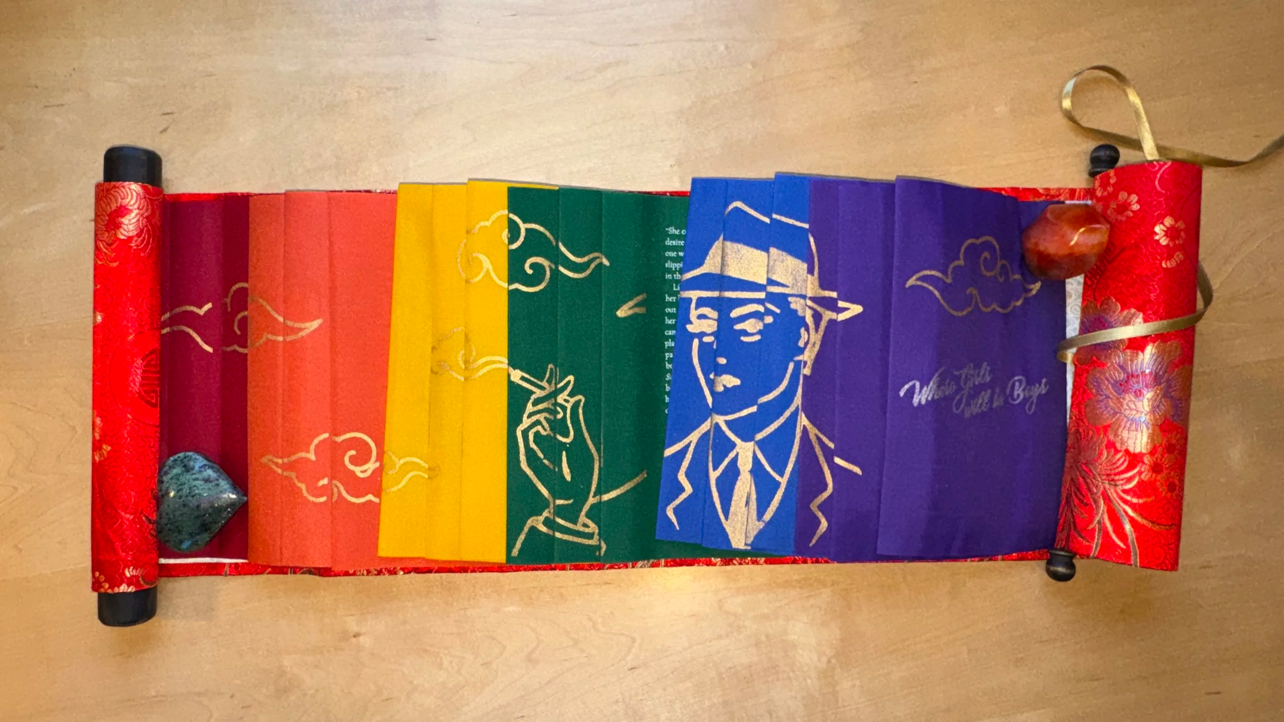 ET: Your short story was the perfect fit for making a dragon scale binding out of the pride flag material, with its combination of Chinese traditions and modern Western queerness. It took me about four months on and off to make, and involved a number of techniques new to me (including traditional wall scroll making!).