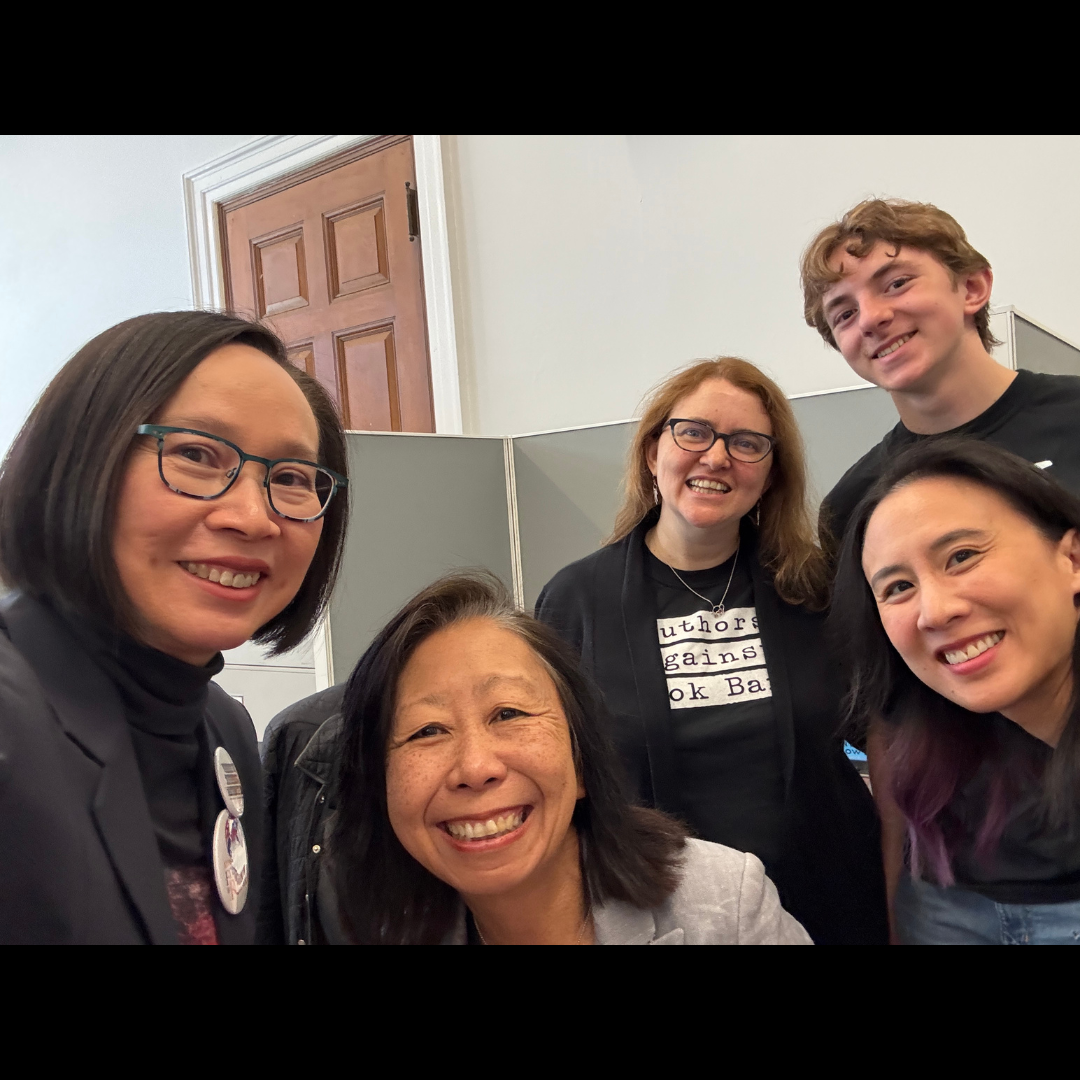 At the Authors Against Book Bans table during our Mass Freedom to Read Book Fair, from L to R: Nic LaRue, Celeste Ng, Vicki Johnson, Dana Alison Levy, Rep. Mike Connolly, Michelle Cusolito, Rep. John Moran, Malinda Lo, Colleen AF Venable, Tui Sutherland, and Federico Erebia.